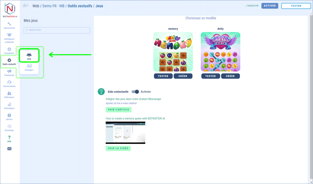 L’interface de création de jeu est accessible en cliquant sur l’icône « Jeux » dans le menu « Outils Exclusifs » de votre chatbot. On vous proposera alors de choisir parmi une liste de modèles de jeux déjà créés.