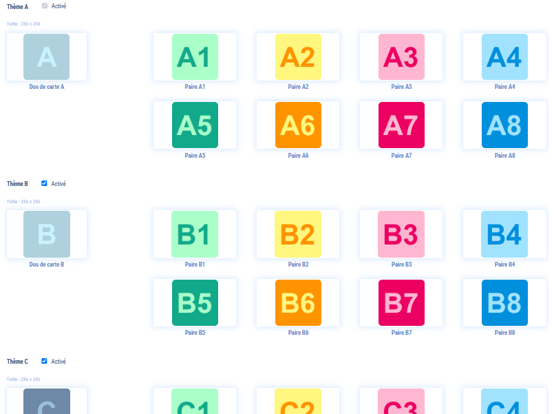 Le modèle de jeu Memory fonctionne avec une rotation de thèmes. C’est-à-dire que si le joueur réussit à trouver toutes les paires du premier thème et qu’il lui reste du temps, le prochain thème dans la rotation lui sera affiché.