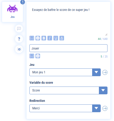 L’intégration du jeu dans le chatbot se fait via la story « Jeu ». Cette story doit obligatoirement se trouver en fin de séquence.