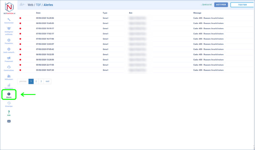 Dans les notifications d’erreur que vous envoie Botnation AI (onglet Alertes de votre espace de création), vous avez sûrement déjà vu la mention suivante : « Code: 400 – Reason: Invalid token ».