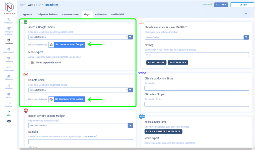 Pour résoudre cela, il vous suffit de vous rendre dans les paramètres de votre chatbot, onglet Plugins et redemander un accès à Google pour Botnation. Cette manipulation se fait en quelques clics et est très rapide, tout comme la première fois que vous avez paramétré le plugin Google (pour Google Sheets ou Gmail).