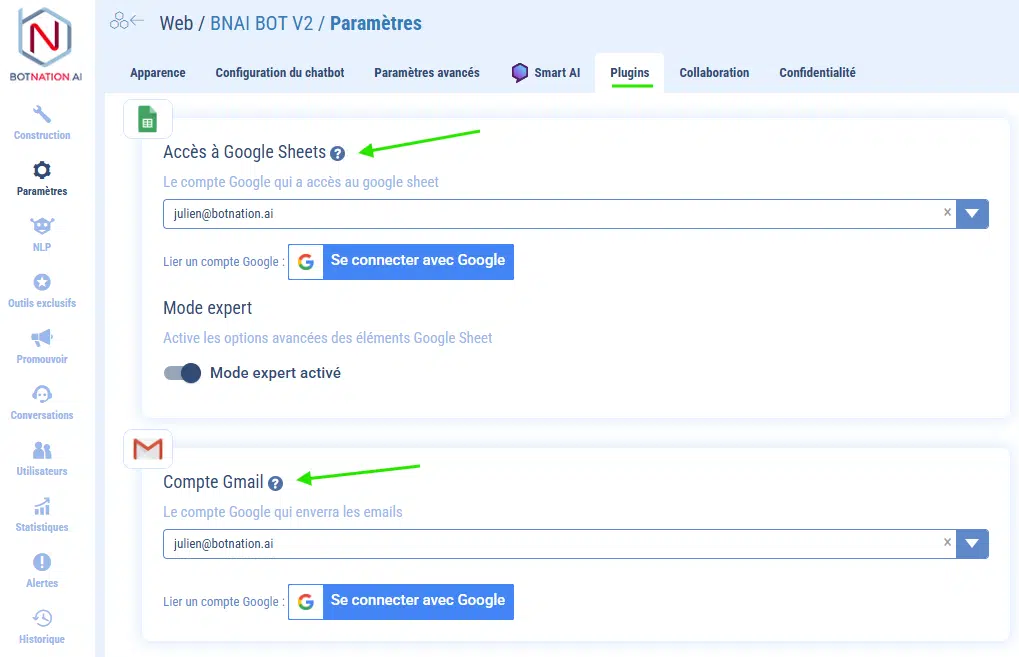 Vérifiez si Botnation AI est bien présent dans « Applications tierces ayant accès à votre compte » avec le droit d’accès Gmail et Google Drive/Doc (pour Google Sheets).