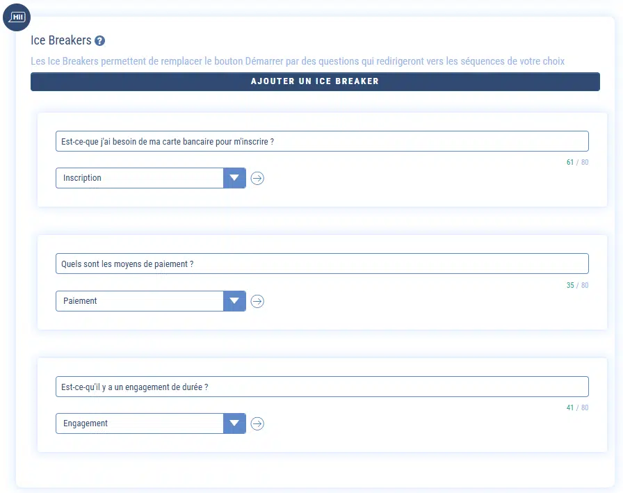 Pour paramétrer ces Ice Breakers, rendez-vous dans les paramètres de votre Chatbot et associez une question à une séquence.