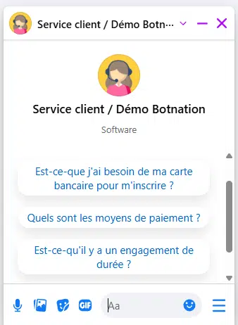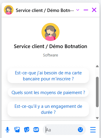 Démarrer une nouvelle conversation avec votre Chatbot pour voir le résultat. Si une discussion est déjà ouverte, supprimer cette discussion puis contactez de nouveau le Chatbot pour voir les Ice Breakers en oeuvre.