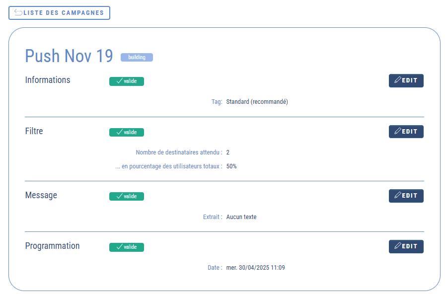 - En cliquant sur une campagne vous accéderez à un résumé. Et si la campagne n’est pas terminée, vous pourrez l’éditer.
