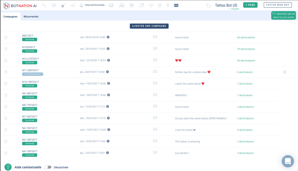 Grâce à la nouvelle version du module « Push notifications » de Botnation vous pouvez envoyer un message à des groupes d’utilisateurs sur Facebook Messenger selon les filtres mis en place. Bien évidemment, vous ne pouvez cibler que les personnes ayant utilisé certaines section de votre chatbot, par le biais des variables. Par ailleurs, vous avez la possibilité de planifier vos notifications et de les relancer aux jours et heures voulus.