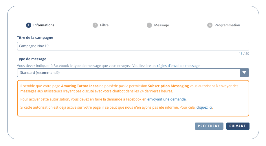 Avant tout : N’oubliez pas que vos utilisateurs doivent avoir auparavant accepté de recevoir des notifications via une action (opt in) dans votre chaque chatbot