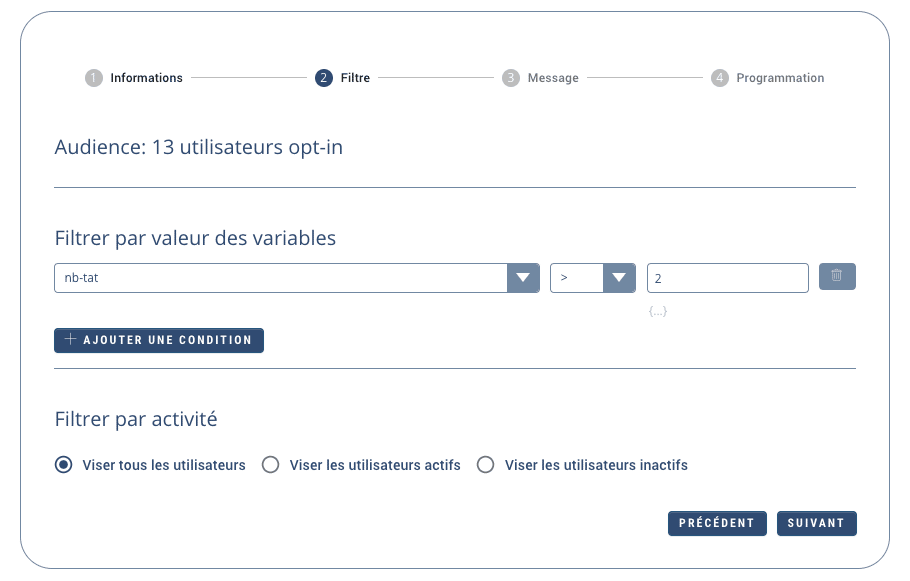 Dans l’exemple ci-dessous, on filtre en n’envoyant la campagne qu’aux utilisateurs à dont la variable associée nb-tat est supérieure à 2.