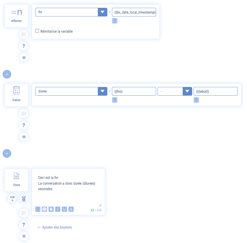 - Puis attribuer la variable {{bn_date_local_timestamp}} à une variable, par exemple {{fin}}, dans une séquence cible (confirmation).
