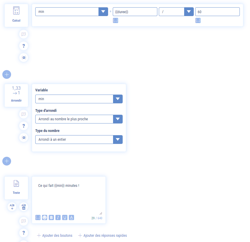 La différence de {{fin}} – {{debut}} sera le nombre de secondes écoulées entre ces 2 évènements. Vous pouvez calculer cette différence par la fonction de calcul disponible sur Botnation.