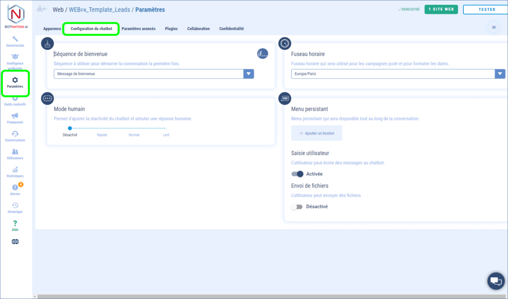 1-  Lorsque vous êtes dans l’espace « Construction », cliquez sur l’icône des « Paramètres » et choisissez l’onglet « Configuration du chatbot »