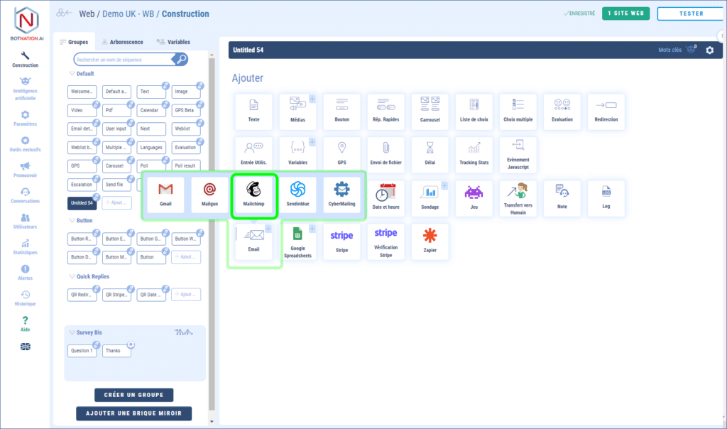 Cela va être beaucoup plus simple. Sélectionnez la fonction Mailchimp dans vos outils Botnation, sous votre séquence.