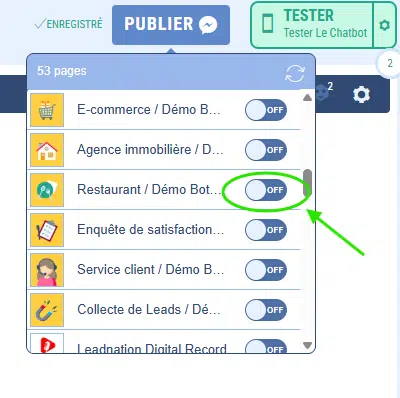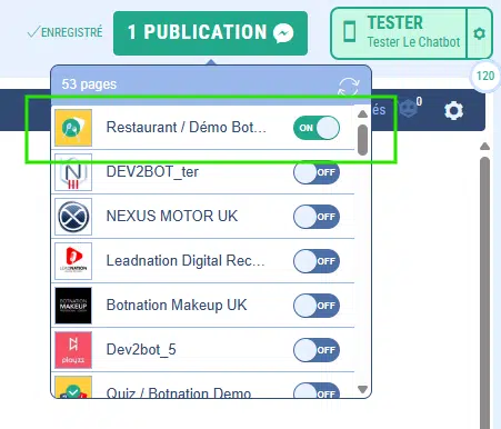 2- Sélectionnez la page Facebook sur laquelle vous souhaitez relier votre chatbot Messenger & cliquez sur « Activer » (ou « enable »).