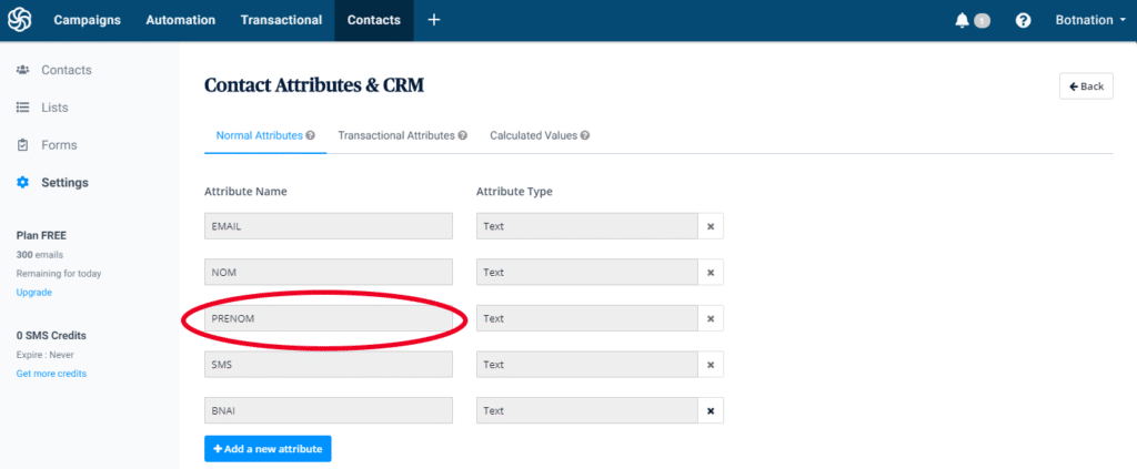 Notez les noms des attributs déclarés chez Brevo, vous pouvez également en ajouter, ils recevrons la valeur de vos variables Botnation.