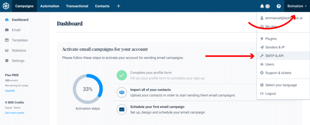 Sur votre « Tableau de Bord » SendinBlue, ouvrez le menu de votre compte (en haut à doite) puis cliquez sur la section « SMTP & API ».
