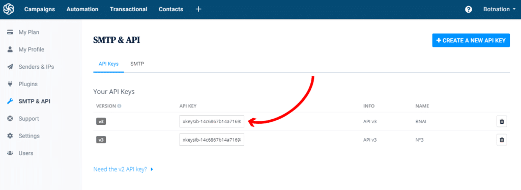 Attention : Votre clé API Brevo doit être au format v3 (version 3). Botnation ne supporte pas l’ancienne API v2 de Brevo.