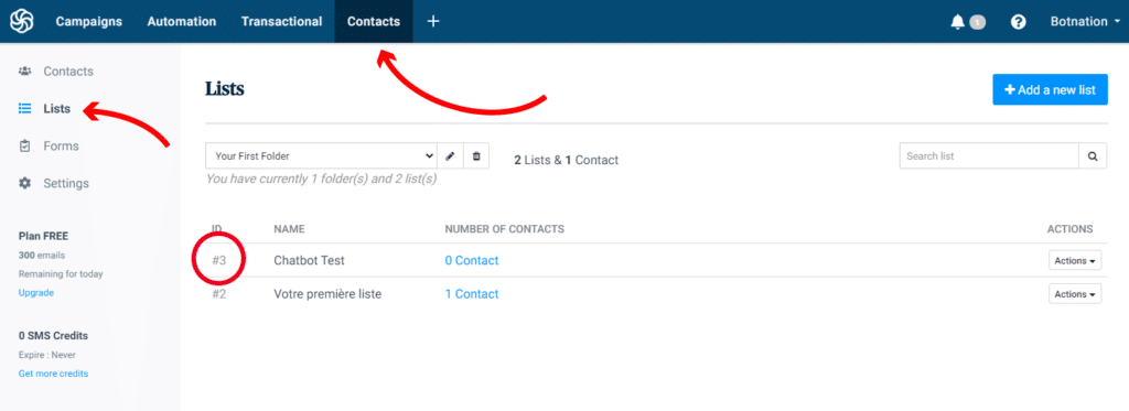 Il vous faut à présent un numéro d’identifiant de liste afin que Botnation ajoute vos utilisateurs sur la bonne liste de contacts Brevo. Pour cela rendez-vous sur le menu « Contacts » (barre du haut) puis l’onglet « Listes » (sur la gauche).