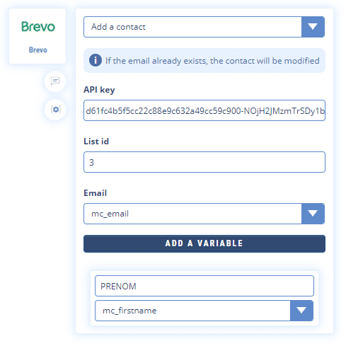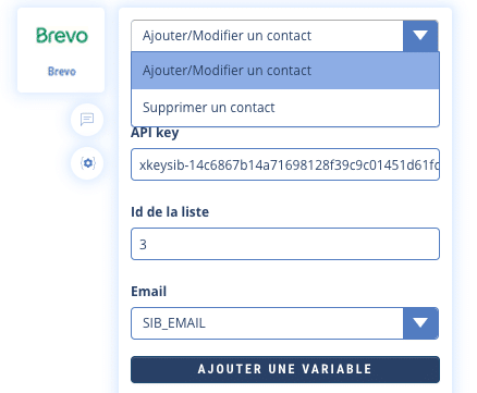 Votre chatbot expédiera alors automatiquement les données collectées dans ces variables à votre liste Brevo pour pouvoir segmenter ou personnaliser vos newsletters.