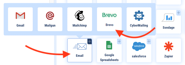 Passons à Botnation. Le connecteur Brevo se trouve dans tiroir « Email » des fonctions de votre chatbot Botnation, en bas de chaque séquence sur votre interface Botnation.