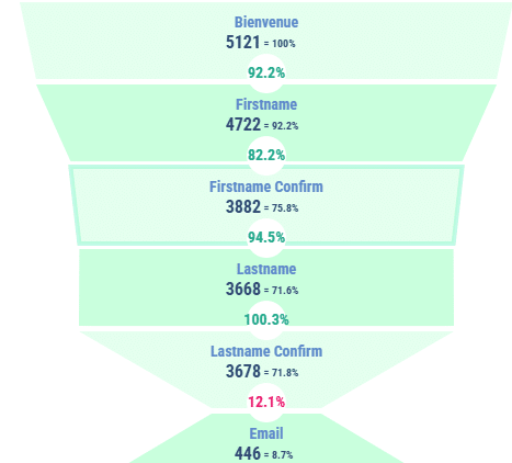On remarque qu’e lors du passage de ‘à l’étape « Lastname Confirm », seul 446 utilisateurs arrivent jusqu’à « Email ». Cela correspond à 12,1% (indiqué en rouge), mais représente 8,7% du total de départ.