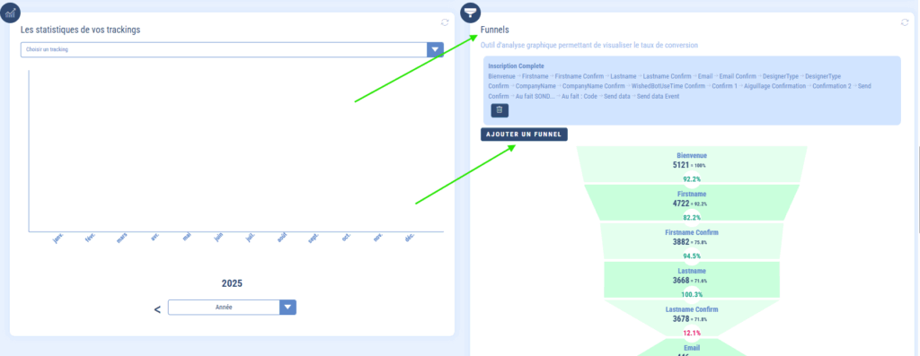 Déroulez la page des statistiques jusqu’à arriver en bas de page dans l’encart « Funnels ». Cliquez sur « Ajouter un funnel ».