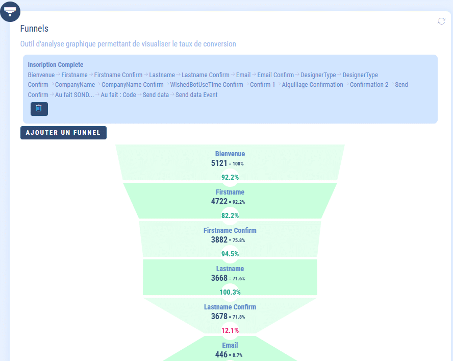 Dans la capture ci-dessus, « Bienvenue » = 5121 utilisateurs, donc 100% car il s’agit de la première étape.