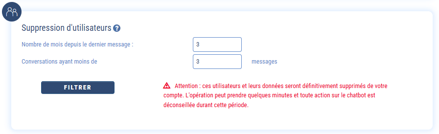 Vous pouvez donc ainsi retrouver les utilisateurs très anciens ou ceux qui ne sont pas vraiment actifs. En cliquant sur le bouton « Filtrer », le module vous affichera tout d’abord le nombre d’utilisateurs correspondant à votre requête. Vous devrez ensuite valider ou non leur suppression. Ce changement sera également visible sur les statistiques de votre chatbot.