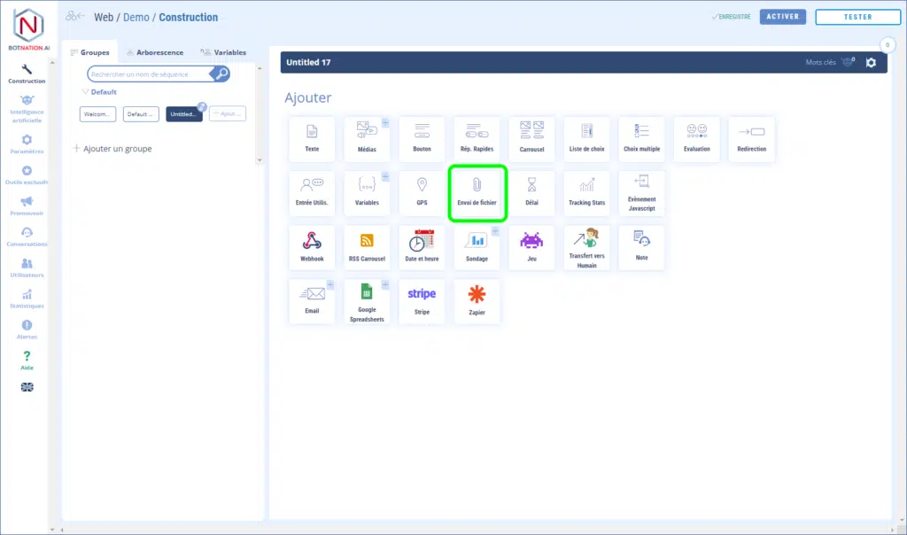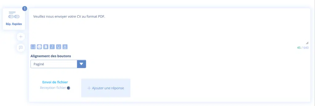 Si vous ne voulez pas que l’envoi de fichier au chatbot soit tout le temps actif, vous pouvez utiliser une Réponse Rapide dans une séquence spécifique.