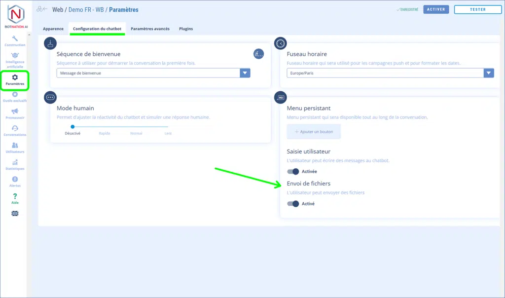 Vous pouvez activer la réception de fichier dans les paramètres de configuration du chatbot.