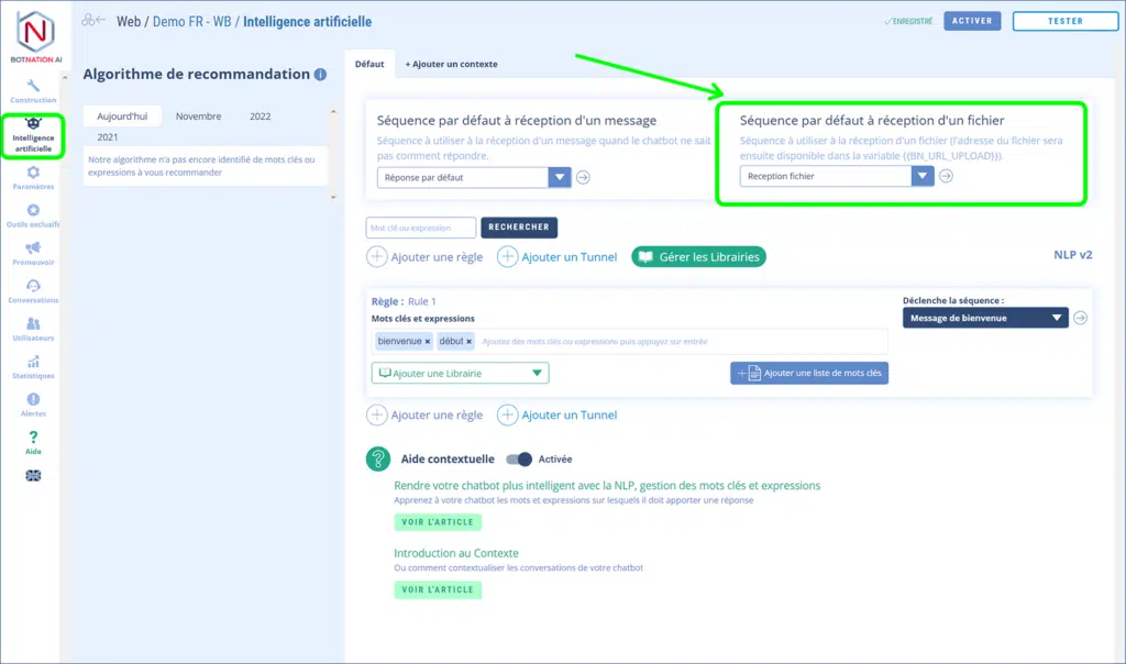 Lorsqu’on active la réception de fichier, il faut créer la séquence qui se déclenchera après la réception et la configurer dans l’onglet Intelligence Artificielle.