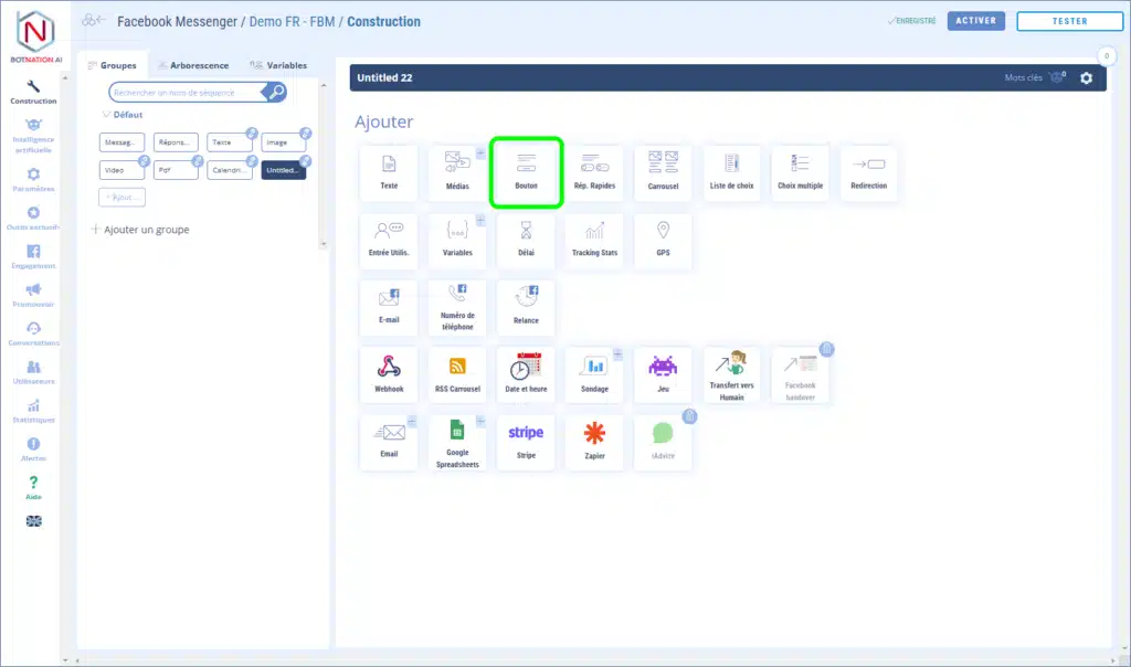 La première consiste à ajouter directement cette fonctionnalité en cliquant sur l’icône « bouton » qui se trouve parmi les autres fonctionnalités. (Voir ci-dessous).