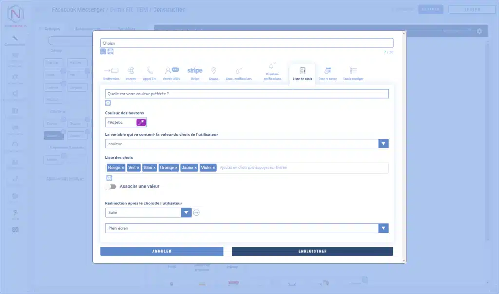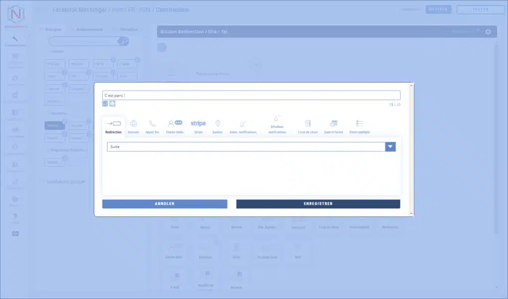 Puis, vous aurez la possibilité de choisir le type d’action que le chatbot effectuera quand l’utilisateur clique le bouton.