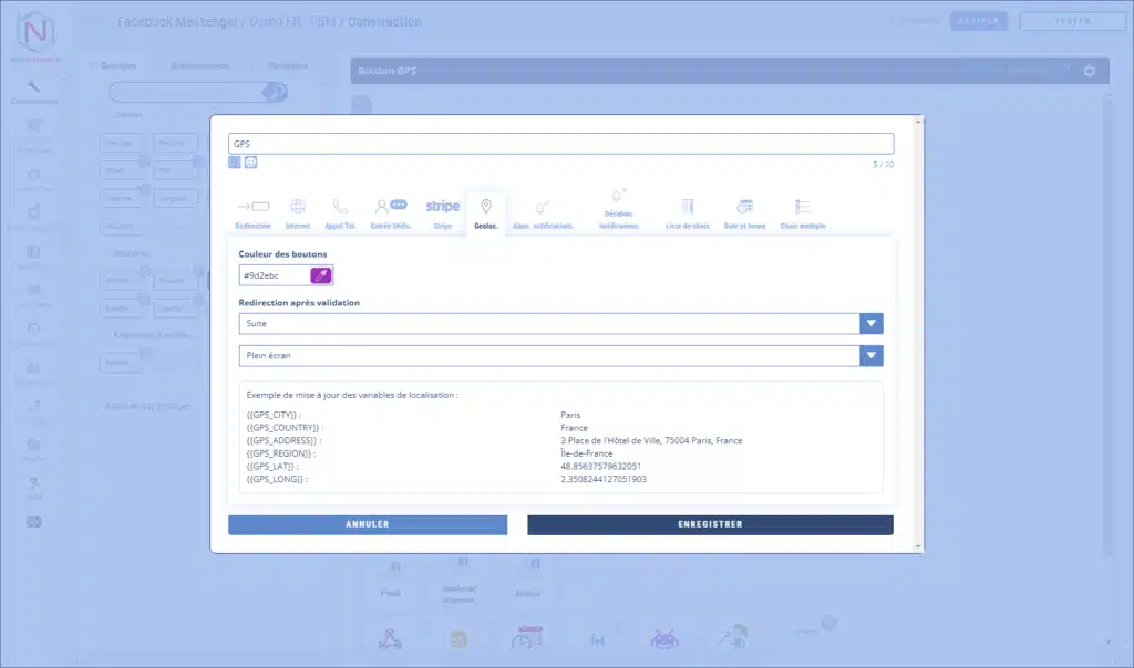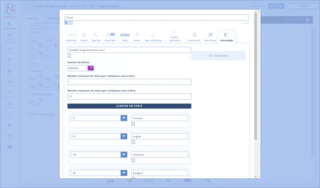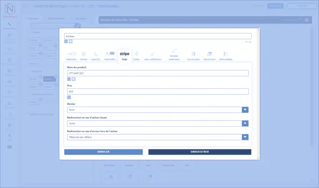 Lorsque vous aurez configuré le plugin Stripe dans les paramètres du chatbot vous aurez la possibilité de paramétrer un bouton d’achat Stripe.