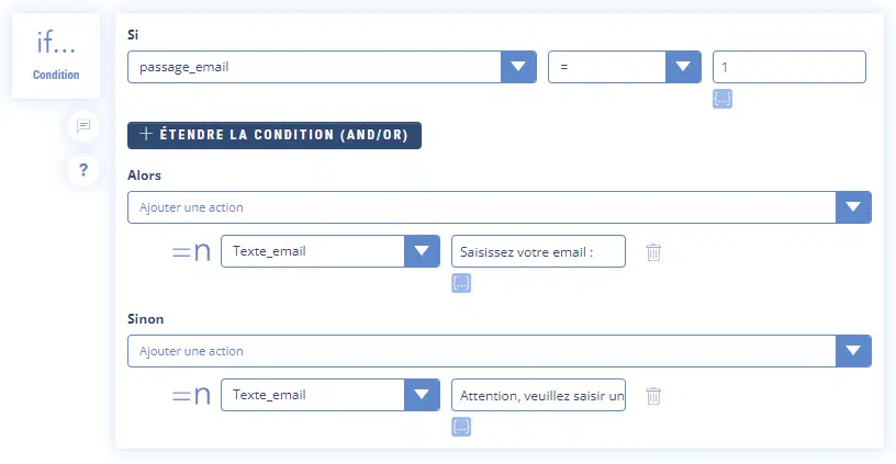 SINON on affectera la valeur « Attention, veuillez saisir un email de type martin@gmail.com : » à la variable « Texte_email » (valable pour tous les autres passages)