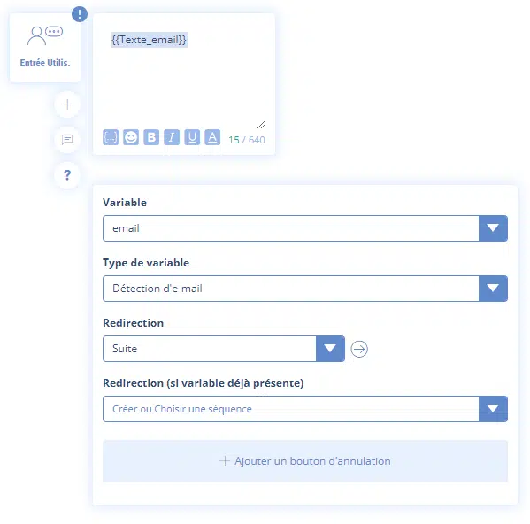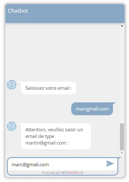 Quand vous choisissez le type de variable « Détection d’email » ou « Détection de nombre« , si la réponse saisie par l’utilisateur ne correspond pas au type correspondant, le chatbot considère que c’est une erreur et rejouera la séquence pour poser à nouveau la question. Hors, en terme d’expérience utilisateur c’est très frustrant de se voir poser la même question en boucle sans aucune explication.
