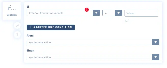 Les Conditions If sont essentielles afin de rendre votre chatbot dynamique. Vous les utiliserez régulièrement afin d’orienter les utilisateurs en fonction de leurs choix et surtout en fonction des données capturées dans des variables lors de leurs réponses. Les Conditions If vont également apporter une logique à votre chatbot pour qu’il prenne les bonnes décisions.