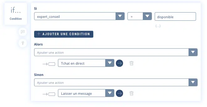 Dans cet exemple, on utilise la fonctionnalité “Condition IF” pour orienter l’utilisateur en fonction de la disponibilité d’un conseiller : SI un conseiller est libre (CAD lorsque la variable “expert_conseil” prend la valeur “disponible”) ALORS on le redirige vers une séquence de tchat en direct, SINON on le redirige vers une séquence sur laquelle il pourra laisser un message.