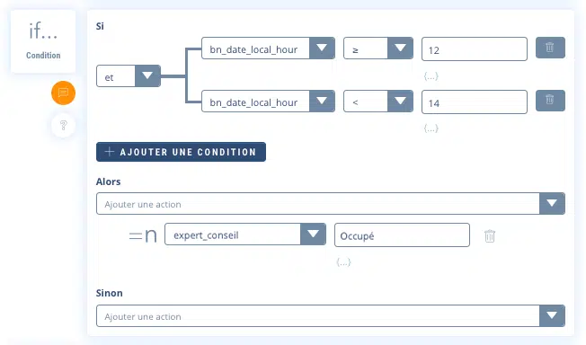 Dans cet exemple, on utilise la fonctionnalité “Condition IF” pour déterminer la disponibilité d’un conseiller en sachant que il n’est pas libre entre 12h et 14h. Cela se traduit par : SI la variable date “bn_date_hour” ≥12 ET SI la variable “bn_date_hour” <14 ALORS le conseiller n’est pas disponible (la variable “expert_conseil” prendra la valeur “Occupé”).
