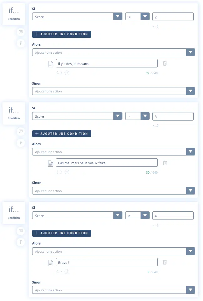 Dans cet exemple, on utilise la fonctionnalité “Condition IF” pour afficher un texte différent selon le score de l’utilisateur (entre 1 et 5).