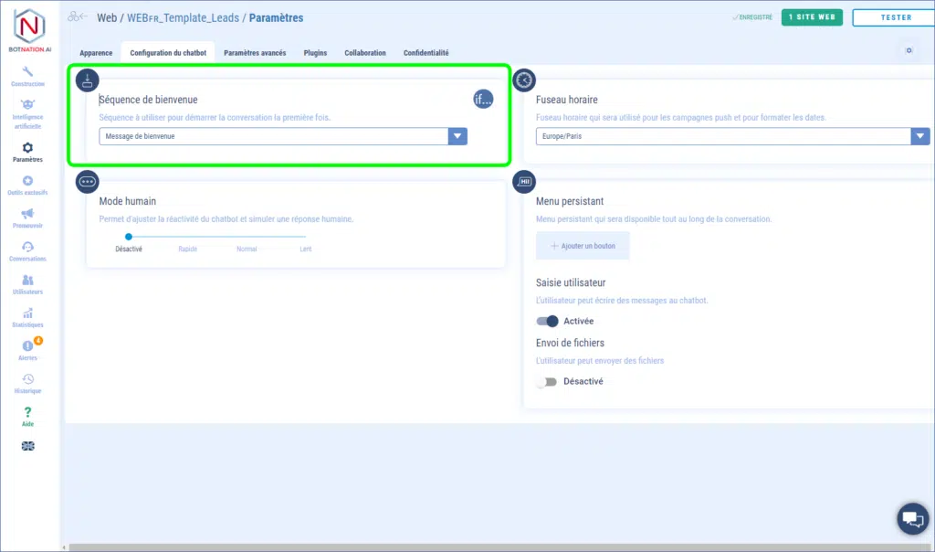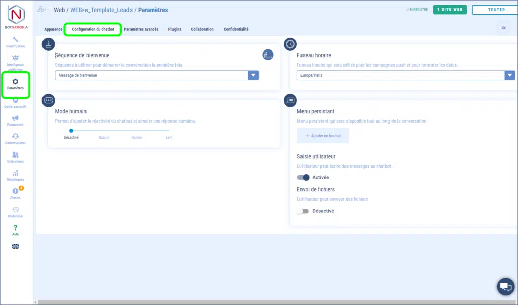 1-  Lorsque vous êtes dans l’espace « Construction », cliquez sur l’icône des « Paramètres » et choisissez l’onglet « Configuration du chatbot »