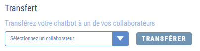 Sur ce même écran il vous est également possible de transférer la propriété d’un chatbot. C’est utile, par exemple, lorsque vous êtes un prestataire en charge d’un développement d’un chatbot, vous pouvez ainsi le livrer « officiellement » sur le compte de votre client. Le chatbot sera alors transféré sur le compte du destinataire et disparaitra du votre. Le nouveau propriétaire en deviendra administrateur et aura à charge sa publication et la facturation.